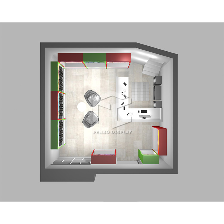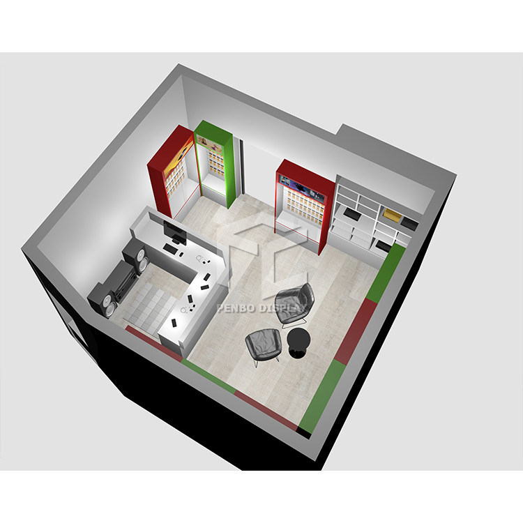 Bu, telefon mağazasının 3 boyutlu çizimidir.Mağazada duvar teşhirleri ve tezgahlar var.